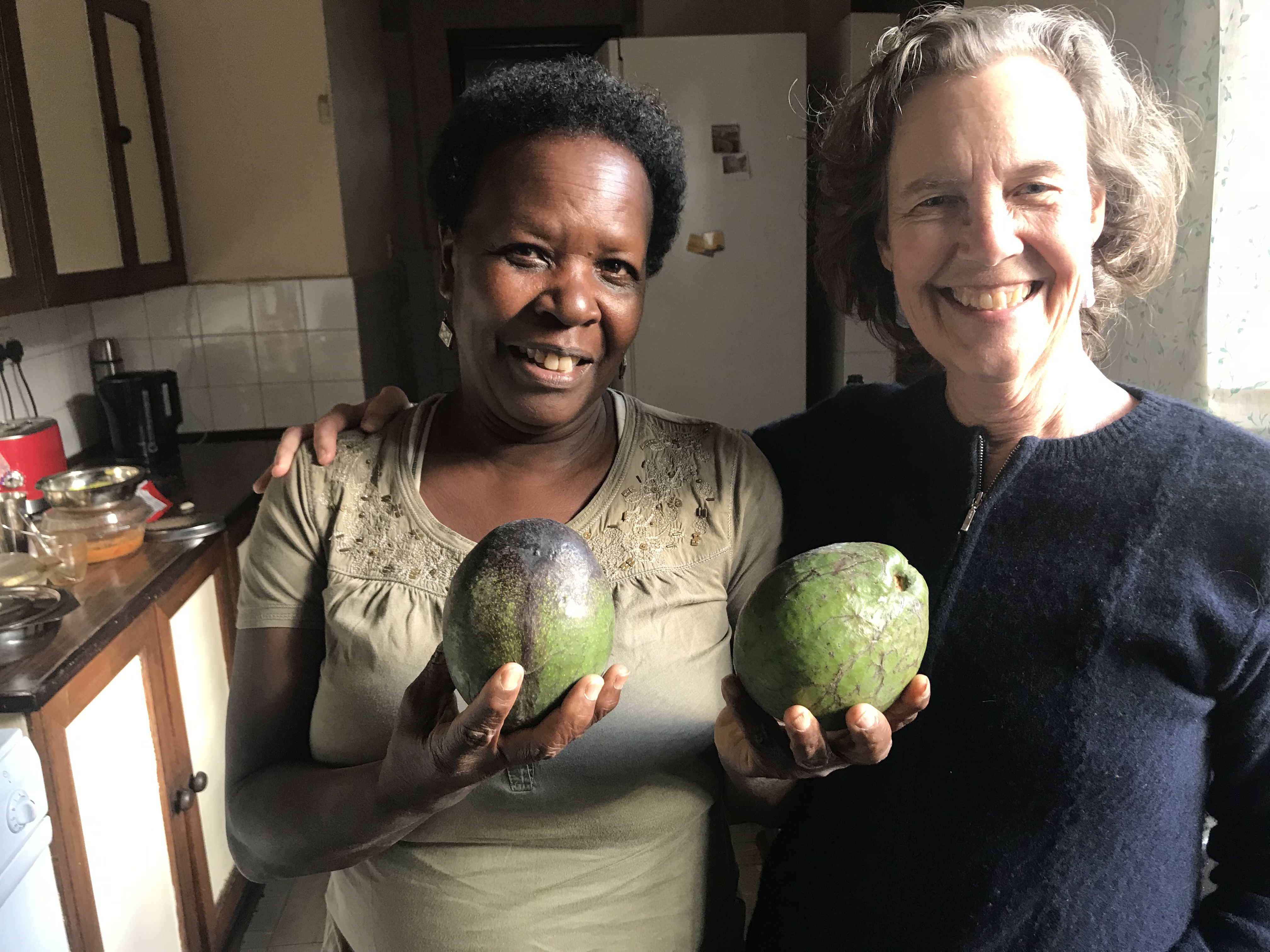 Shirley Stones (L) shows off her avocados from her tree, with Kathy Beach.