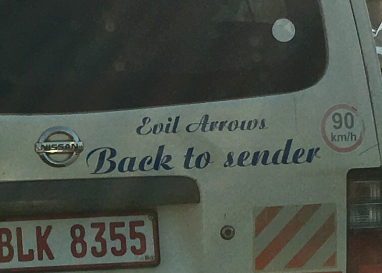 Many of the minibuses have sayings on them. My taxi driver says that it is to protect the driver and passengers. No evil arrows are going to get this one!