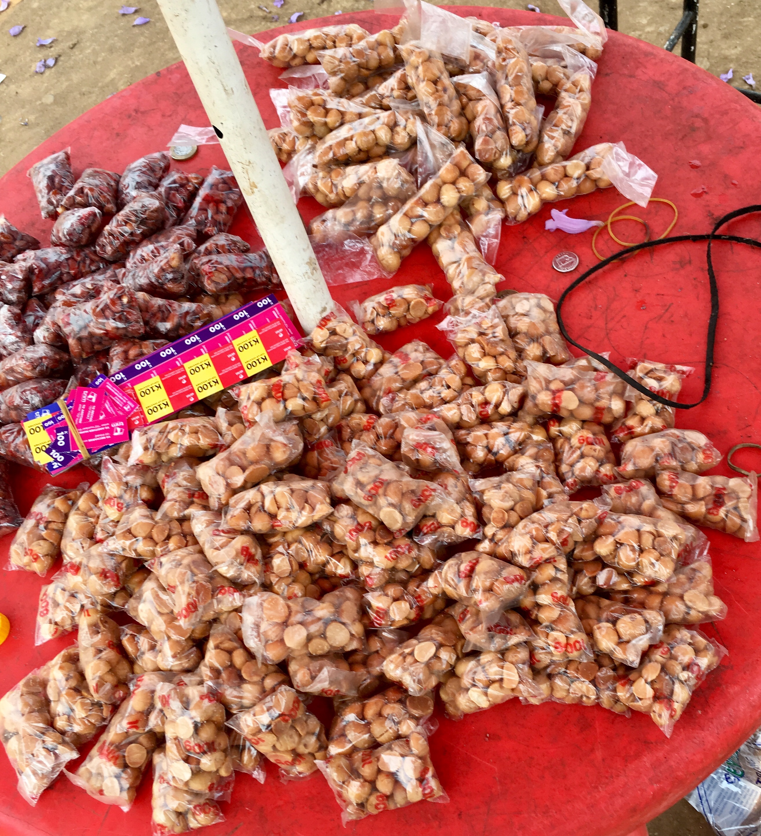 One of my favorite treats here: Roasted macadamia nuts in small packages. The small packs in front cost around 14 cents, the longer ones in back about 21 cents.