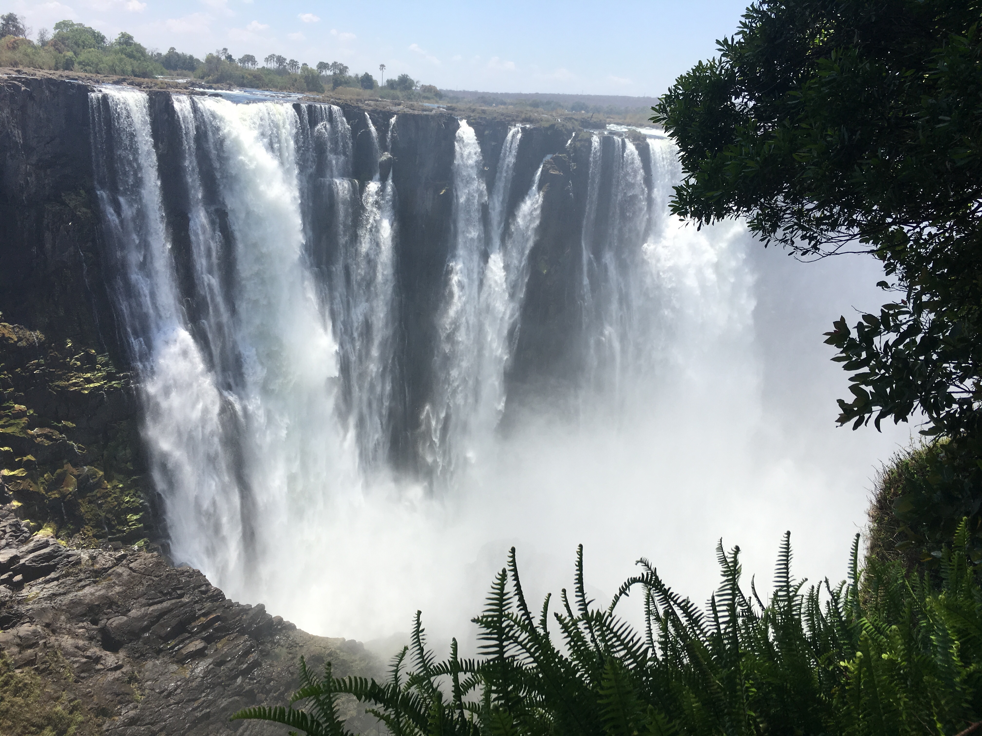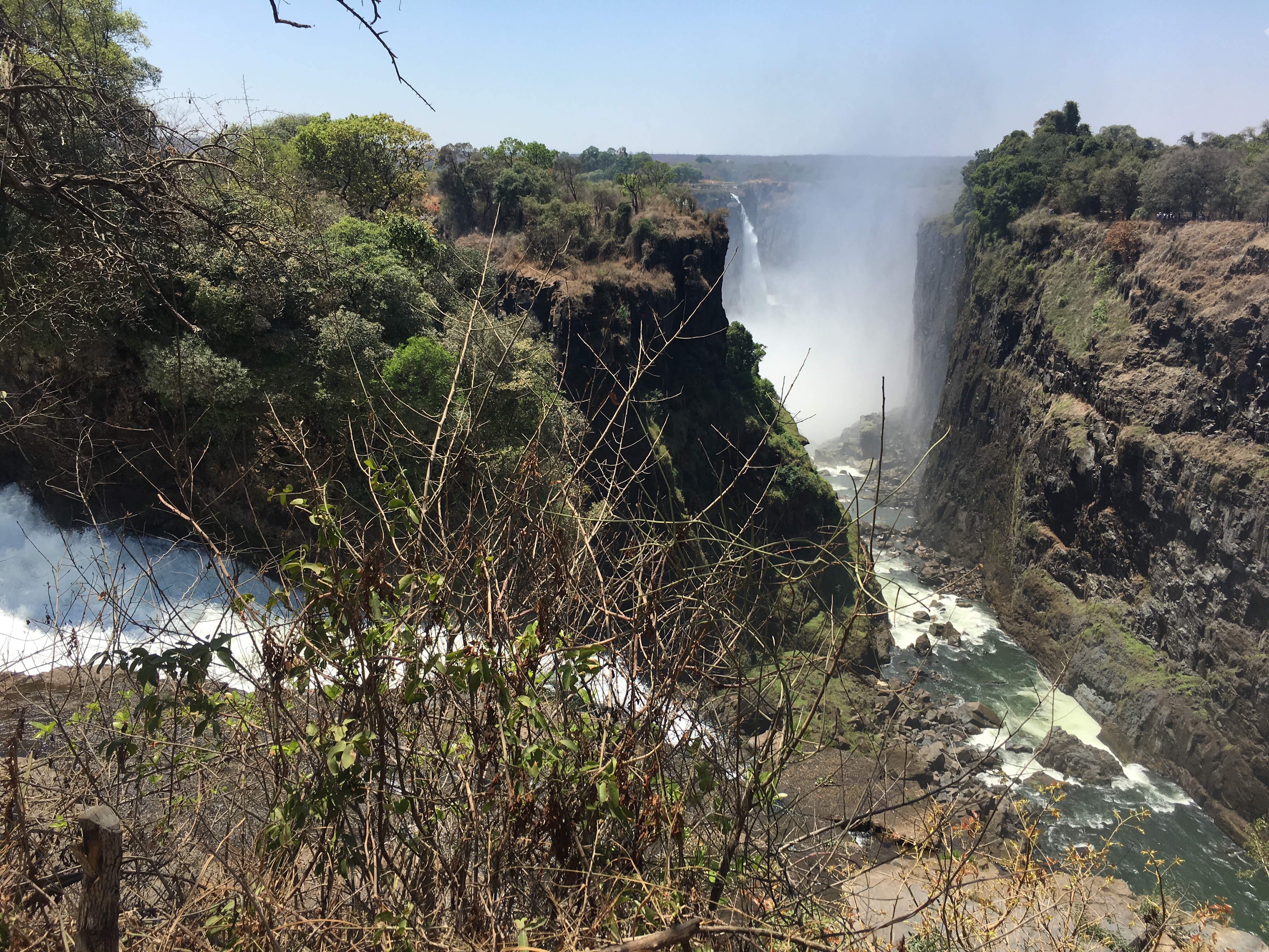 Victoria Falls is on the Zambezi River, which forms part of the border between Zimbabwe and Zambia. Its tourism supports two towns, Livingstone, Zambia and Victoria Falls, Zimbabwe, and if you want to see it from both sides, you need to get visas to both countries. October is the hot dry season and the water flow is reportedly about 10% of the high flow in April, when the rainy season swells the Zambezi River. Seeing it at low flow was still spectacular!