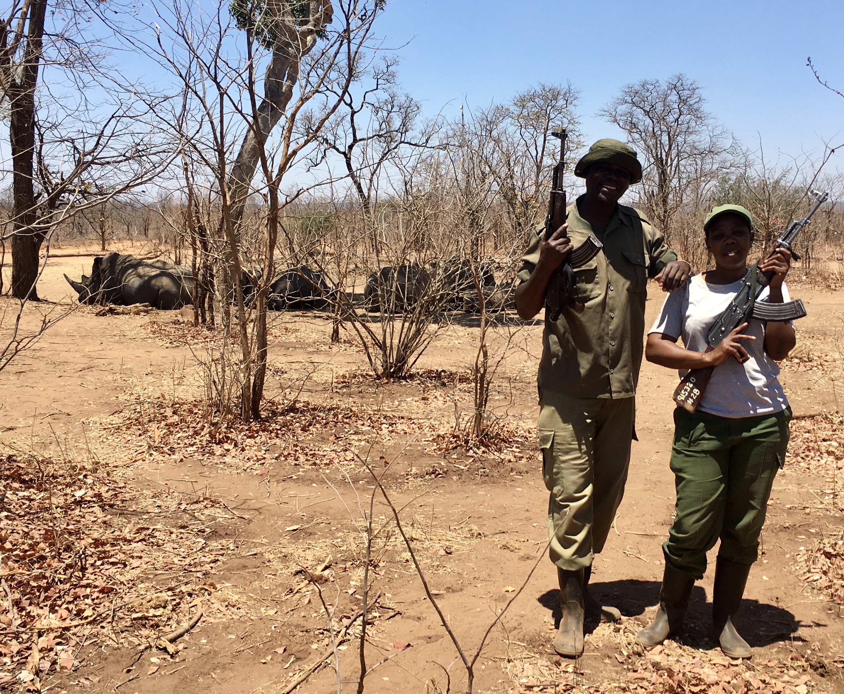 Of course, while we were traveling, we wanted to see more than Victoria Falls. The next day we went on a safari to a park near the town of Livingstone, named after the Falls, Mousi-ou-Tunya. The highlight of the safari was the rhino walk, where you are allowed to get (sort of) close to the family of rhinoceros that live there. They have their own around-the-clock armed guards. The guards told us that the guns were not to protect us from the rhinos, but to scare off any poachers. And so far it has worked.